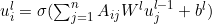 - A node i at level l will have representation uli, which can be computed using ul-1i