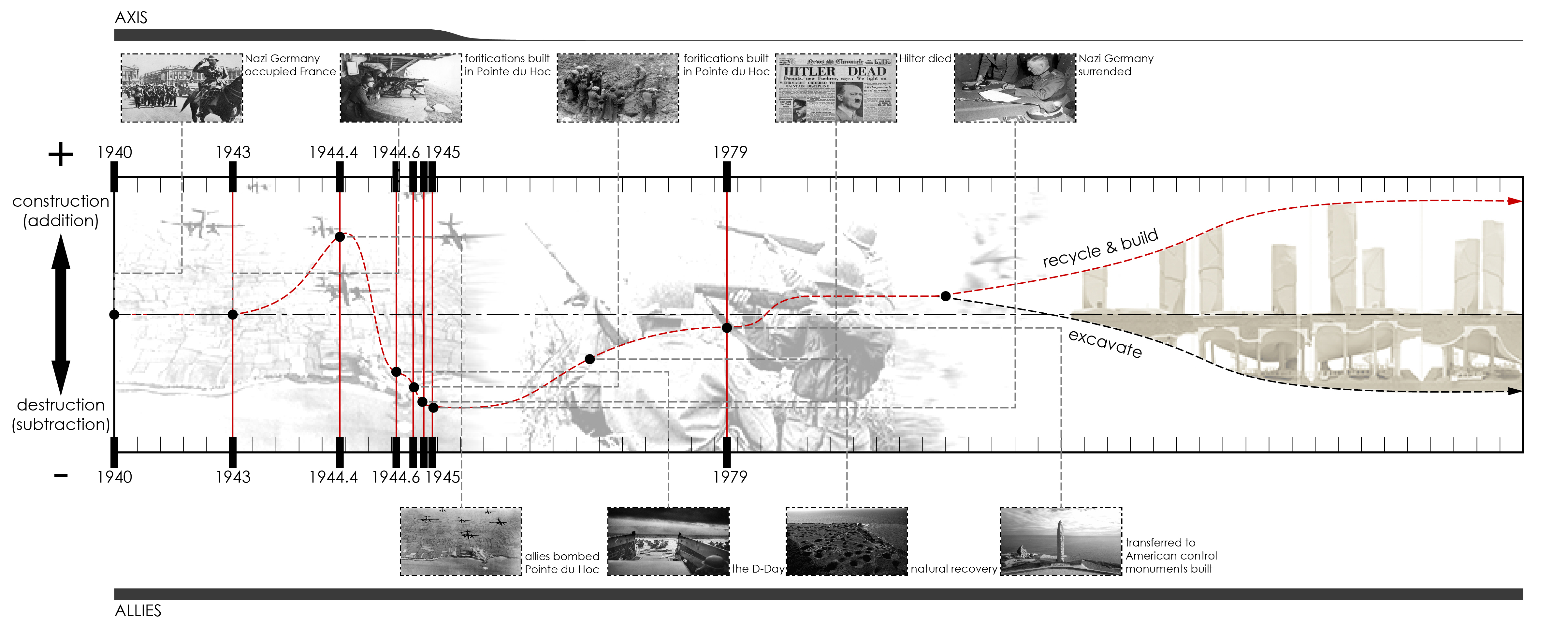 geological timeline of Pointe du HocGiven the fact that humans are increasingly capable of transforming the natural environment through the development of advanced technologies, we might argue that any approach to design should necessarily be considered within a broader context of geological time, which is to say, the future of the planet itself, in which any distinction between the natural and the manmade is by definition delusional. Considering Pointe du Hoc is a place which went through interchanging massice constrcution and deconstruction, my intervention here will be an ambiguous condition between the dichotomy.