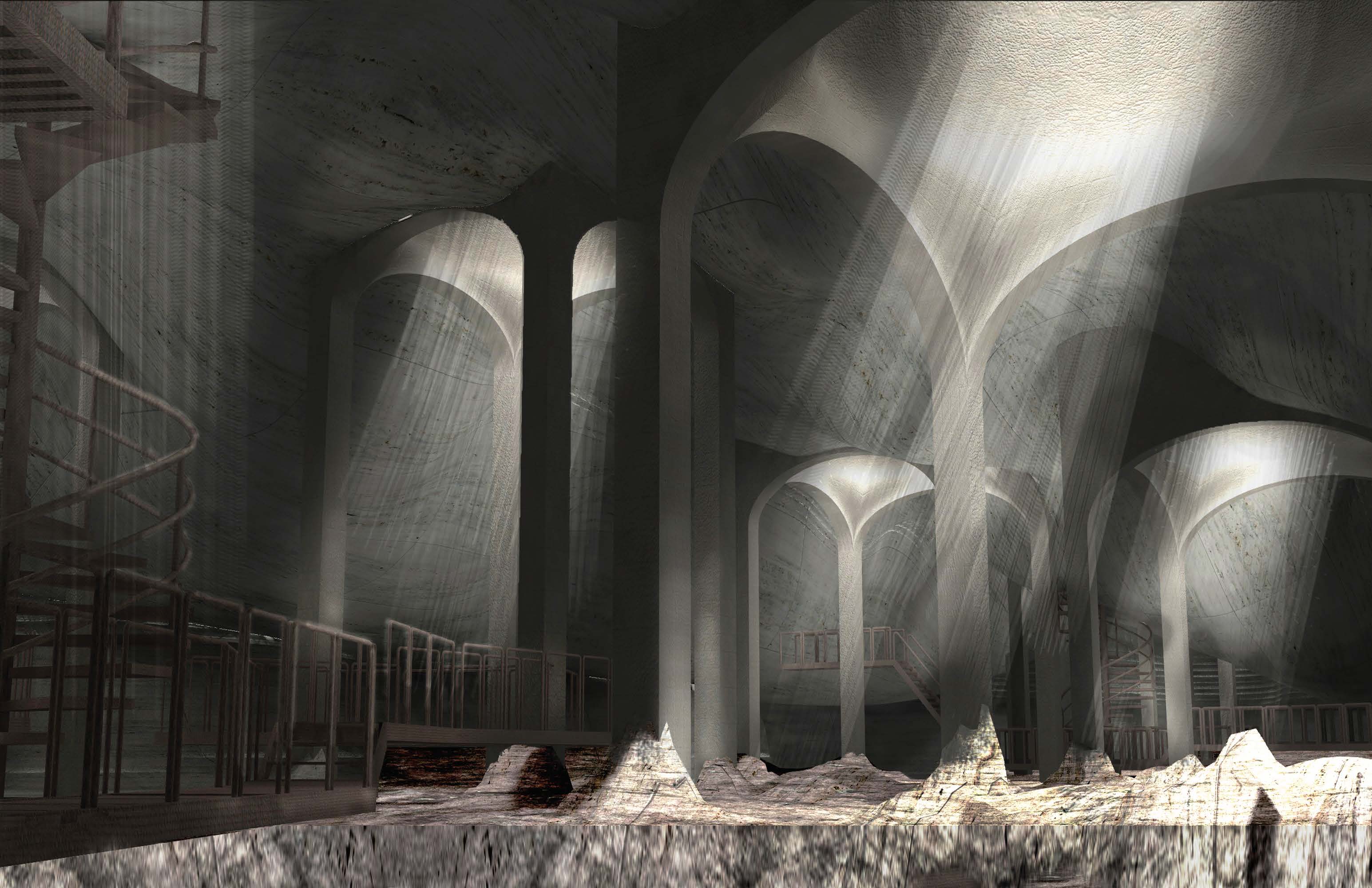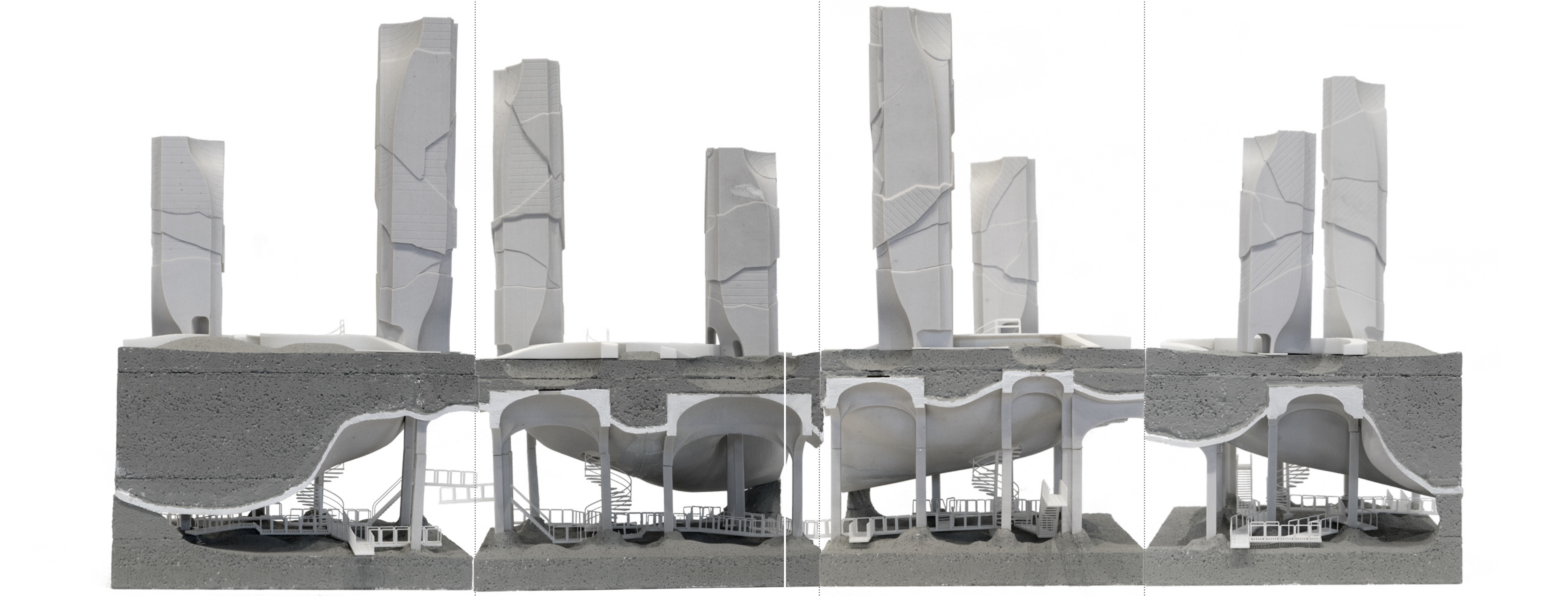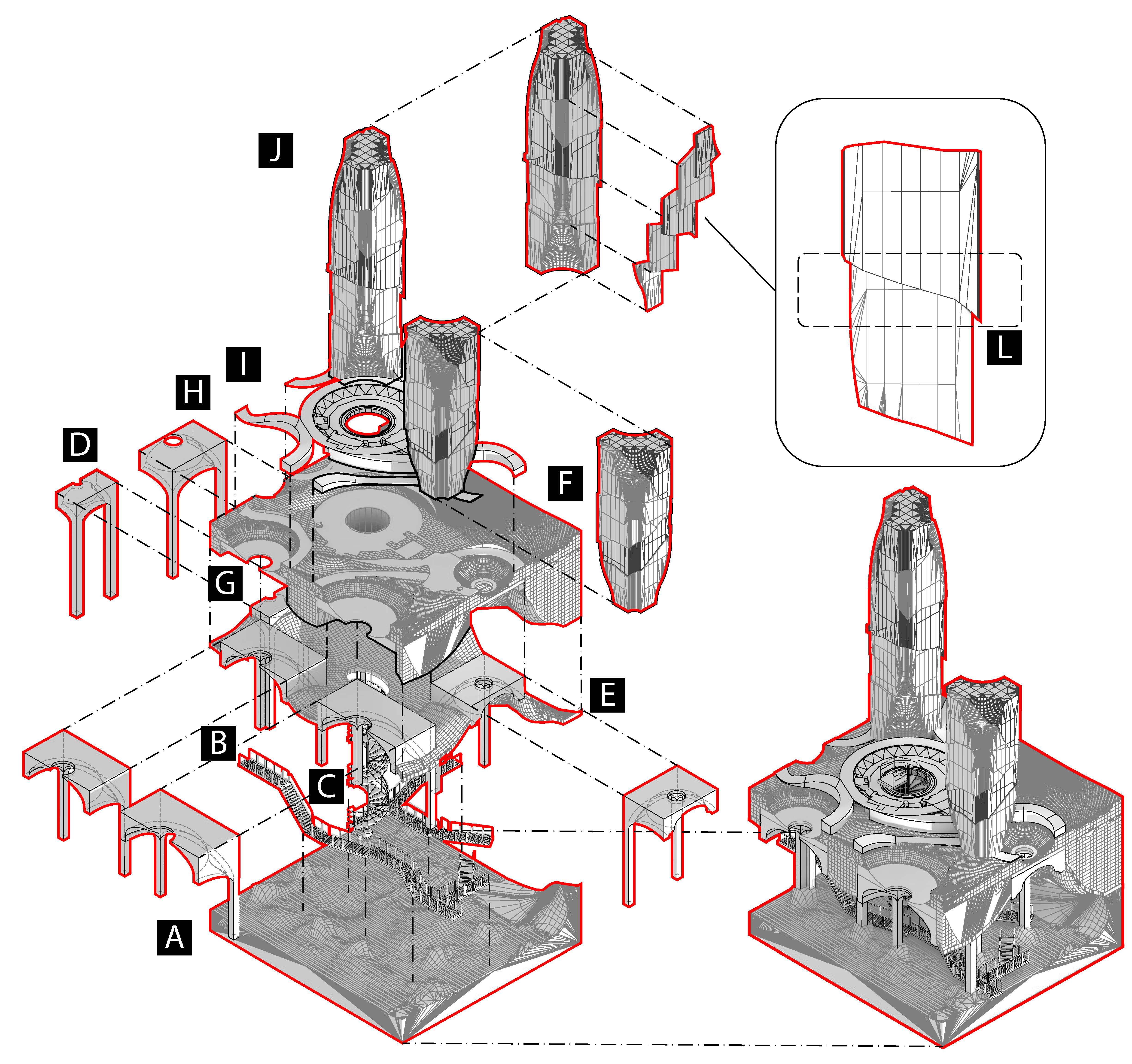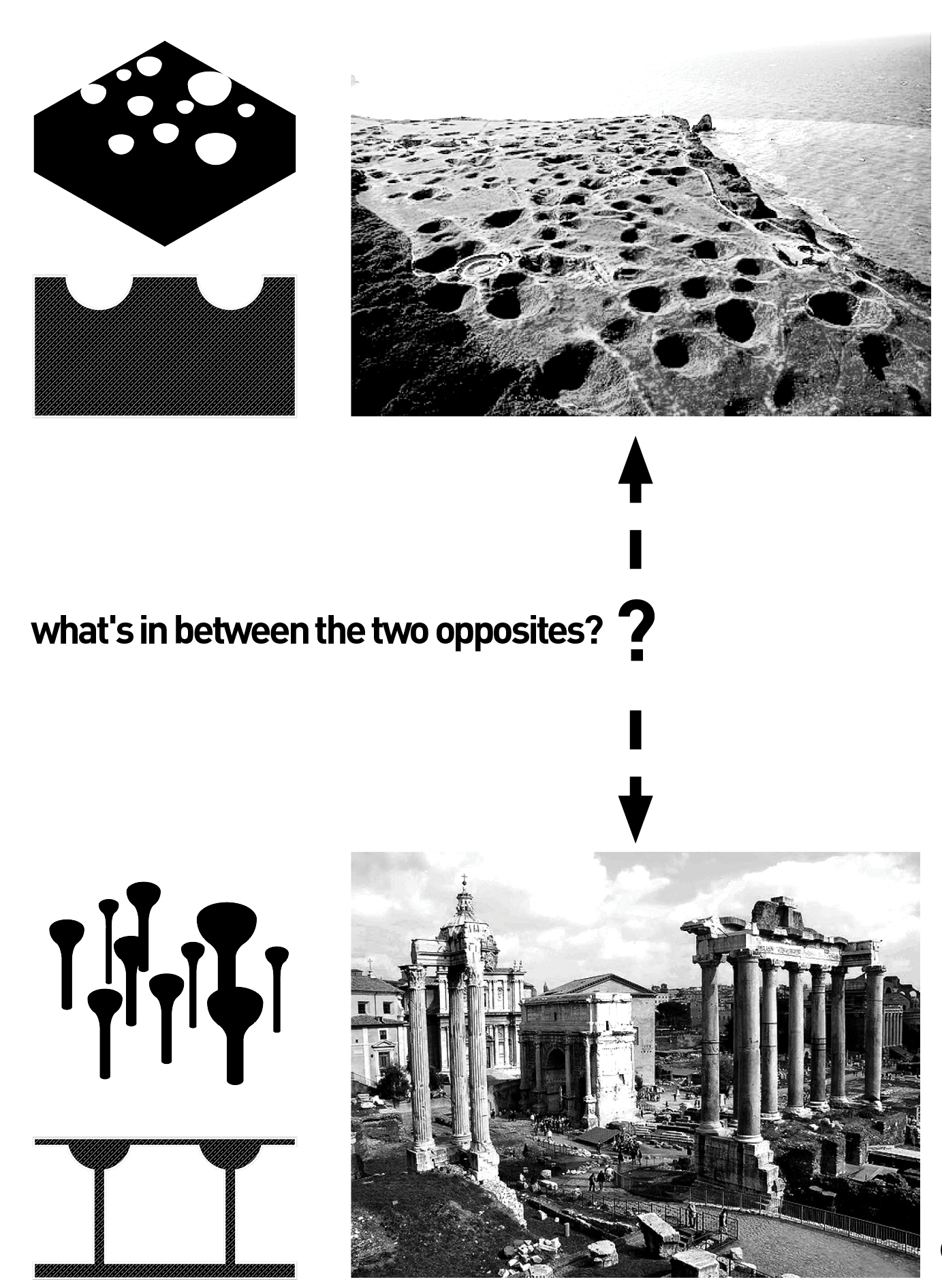 proposed formal algorithm to generate the reconciliation between crater and columnBased on this iterative history of interchangeable processes of destruction and reconstruction, the series of design experiments illustrated here attempts to explore the possibility of whether or not conventional boundaries of distinction, such as mass vs. void, tectonic vs. topographic, and subtraction vs. addition, might be considered inherently ambiguous as well. In order to reconcile the column and the crater, an new pillar system was developed.